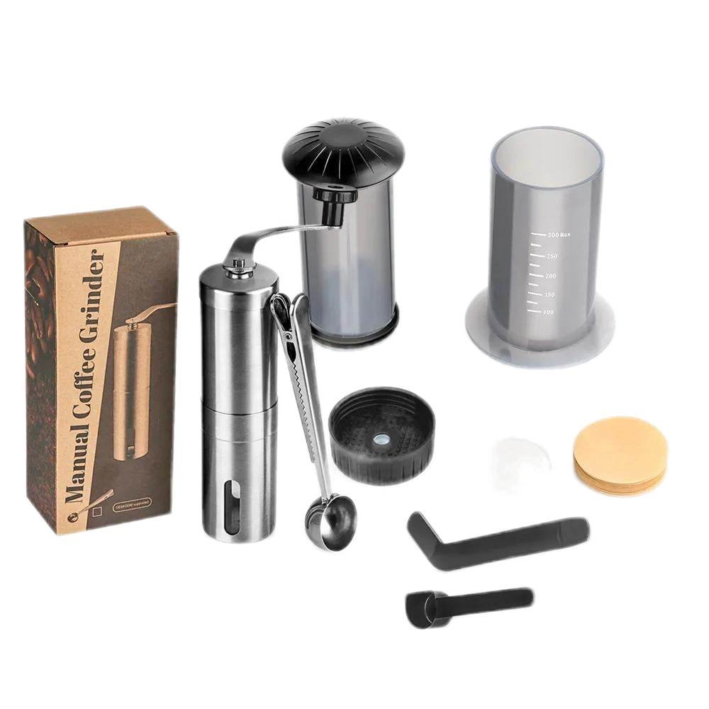 تأتي هذه المجموعة المتكاملة مزودة بمكبس فرنسي، طقم ورق ترشيح، وطقم بار يشمل مطحنة قهوة، لتضمن لك تجربة تحضير احترافية تليق بالمقاهي الراقية أو الاستخدام المنزلي.